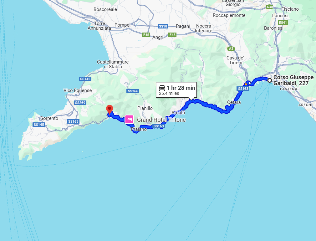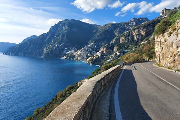 Amalfi Drive, also called Strada Statale 163 Amalfitana, or SS163, is the main road that runs along the Amalfi Coast. Without stops or traffic, it takes about a hour and a half to ride the entire length of this road.