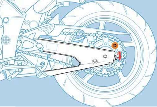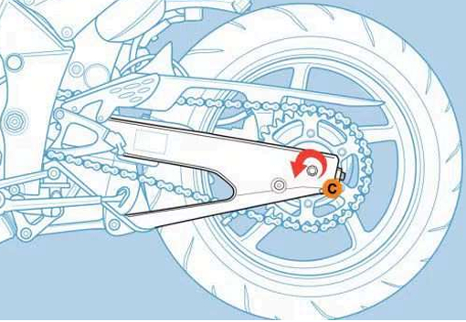 Adjust the chain – turn the adjuster nuts quarter of a turn at a time on both sides of the swing arm.