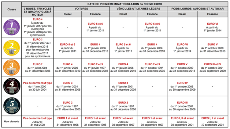 The air quality certificate, better known as the “Crit’Air sticker,” determines whether various types of vehicles—motorbikes, cars, vans, or trucks—are allowed to circulate in ZFEs. It’s based on the vehicle’s first registration date or its EURO standard, along with its engine type. Officially launched on June 24, 2016, it followed the decree establishing how vehicles are classified according to their level of atmospheric pollutant emissions.