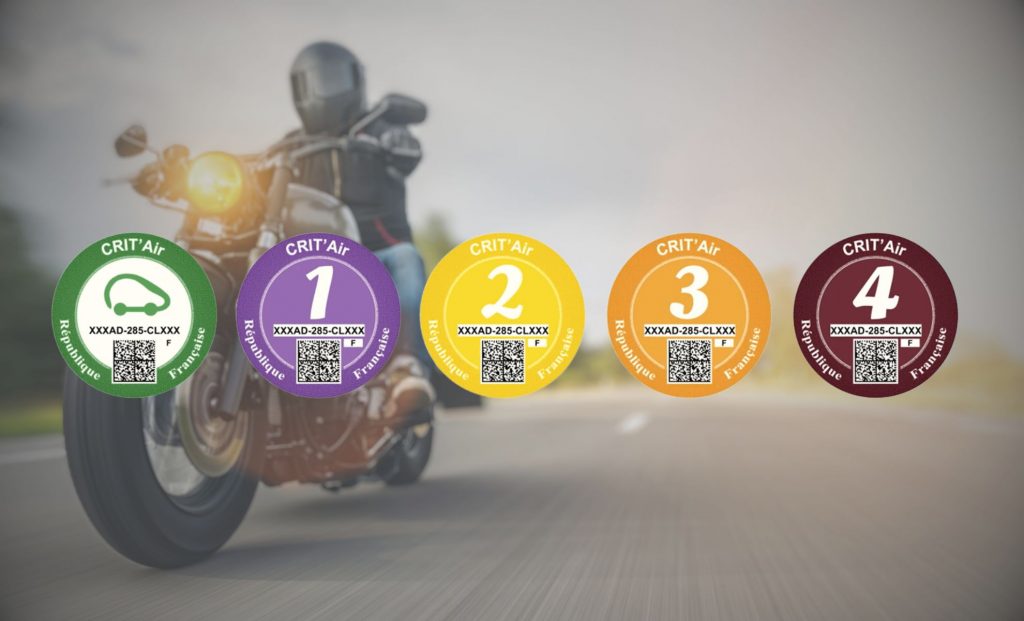 Each Crit’Air motorcycle category is marked by a specific colour and number, showing the pollution level and registration date based on the Euro standard.