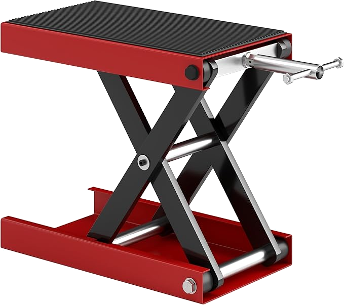 The expanding design features bottom and top platforms that move together or apart using the side crank handle, letting you adjust to a comfortable height for working under your bike. The X-shaped centre adds balance and stability to the motorcycle jack.
