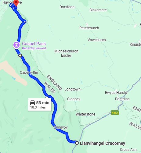 The Gospel Pass is the highest road pass in Wales. It is at the head of the Vale of Ewyas in the Black Mountains of southeast Wales. Starting from Hay-on-Wye the narrow mountain road climbs steeply to a height of 549 metres (1,801 ft) above sea level, squeezing between the mountains of Twmpa to the west and Hay Bluff to the east, before dropping down into the valley to the south on its way to Llanthony Priory, Llanfihangel Crucorney and Abergavenny. At one time a small lead-mining operation was established at the pass.