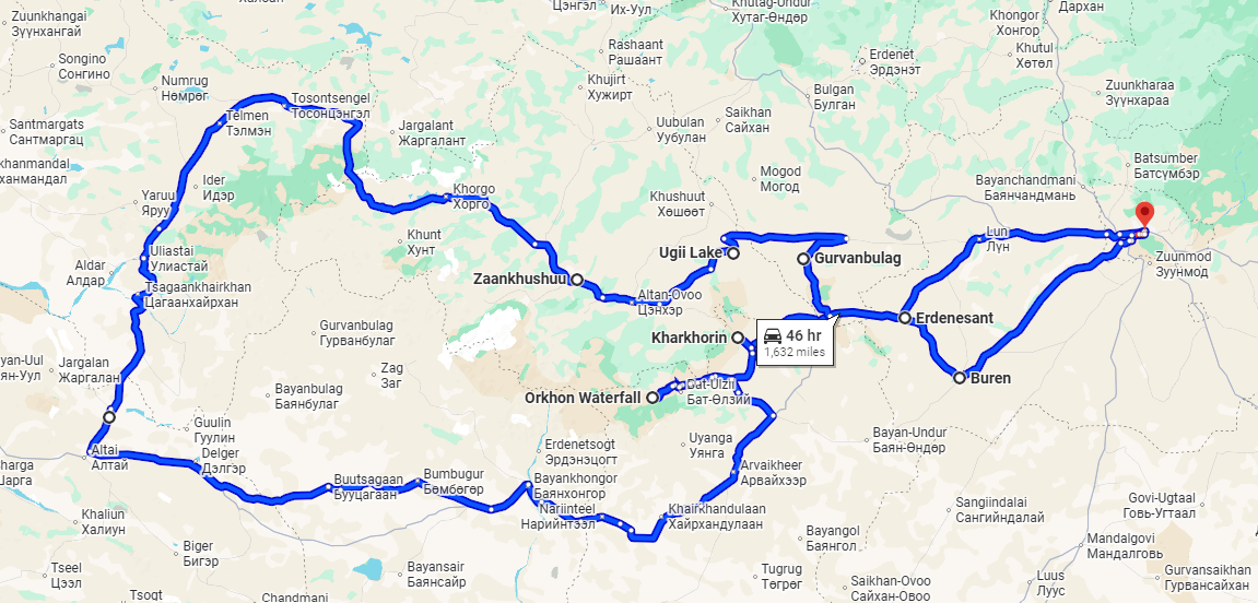Ulaanbaatar, Buren, Kharkhorin, Orkhon Waterfall, Zaankhushuu, Ugii Lake, Gurvanbulag, Erdenesant.