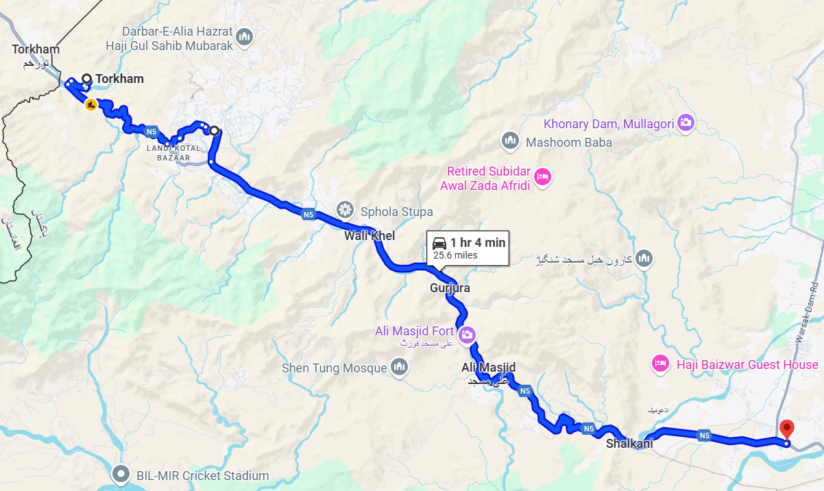 The Khyber Pass is a mountain pass in the Khyber Pakhtunkhwa province of Pakistan, on the border with the Nangarhar Province of Afghanistan. It connects the town of Landi Kotal to the Valley of Peshawar at Jamrud by traversing part of the White Mountains. Since it was part of the ancient Silk Road, it has been a vital trade route between Central Asia and the Indian subcontinent and a strategic military choke point for various states that controlled it.