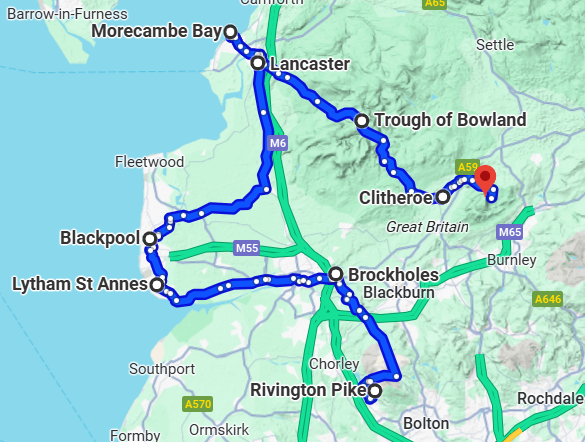 - End: Pendle Hill (Nelson) or Rivington Pike (Bolton)
