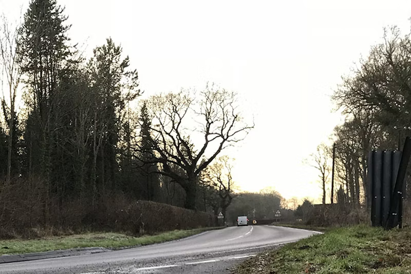 - The opening in the hedge to the left of the van indicates the possible presence of a side road branching off from the corner.