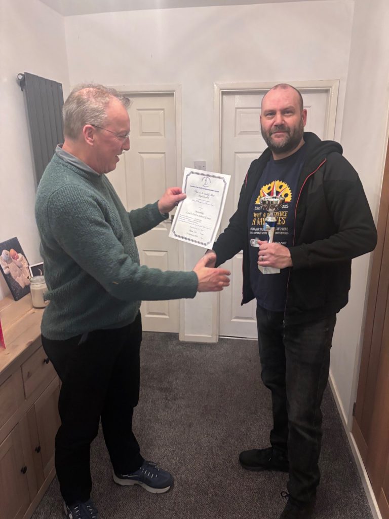 Unfortunately due to other commitments, Nige was unable to attend the yearly prize giving, however Russell George the Chairman of the association visited Nige and delivered his certificate of achievement and also the trophy.