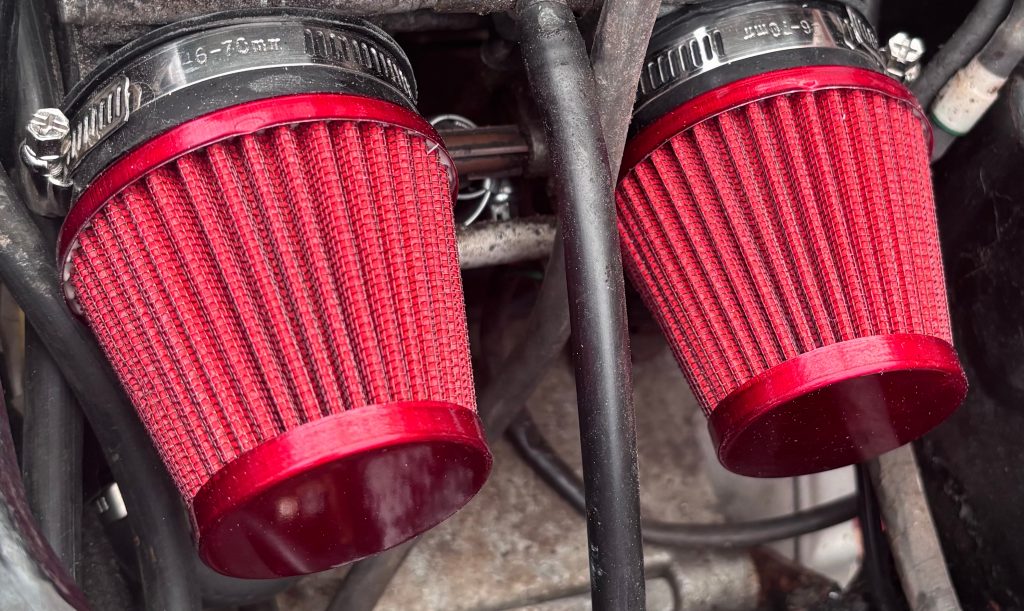 In other news, RS Motorworx have provided a new set of tyres and valve caps as well as a pretty set of cone air filters (unfortunately when I was upgrading and modifying the fuel lines, they run directly where the original air box sits so I am no longer able to use it). Yes the engine needs a good clean, but that, I am hoping is a last minute job there are far more pressing issues to deal with first.