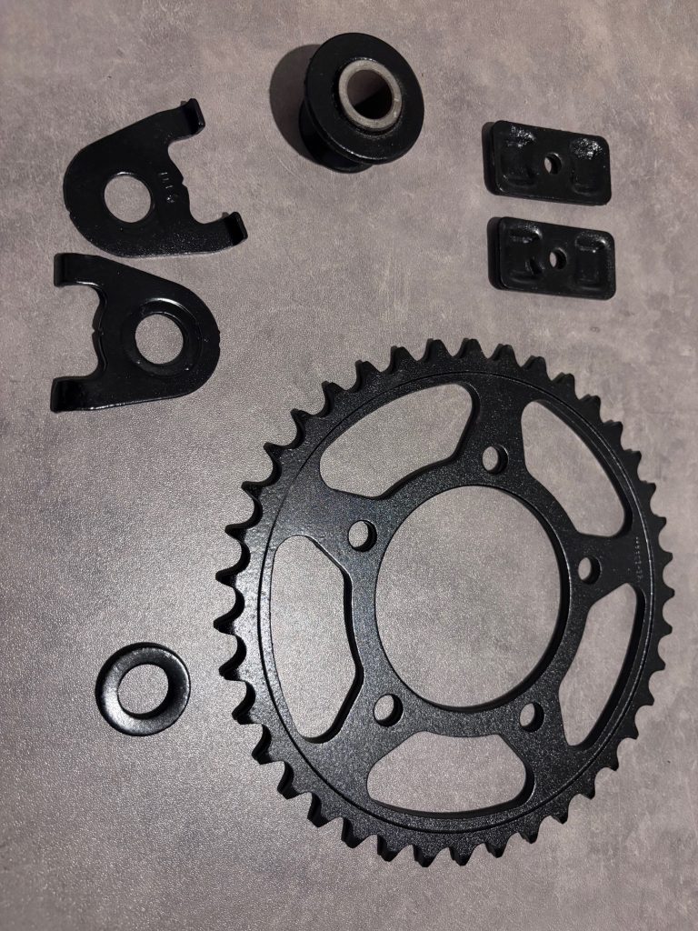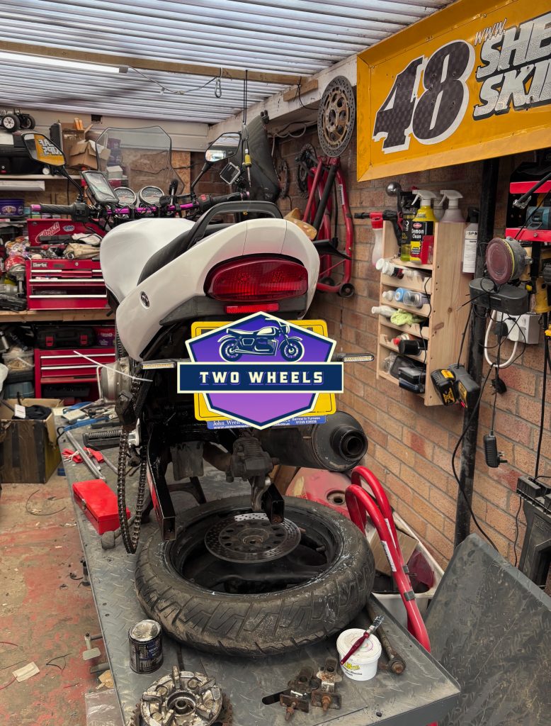 The hardest job today was swapping the rear tyre that was on Jamie’s wheel and putting it onto the original GS500 rear wheel (the wheels from Jamie will be getting a colour change and new tyres, but for now I want to keep the bike ‘rolling’), while Dan was cleaning and painting the frame and swing arm. You don’t think how much grime gets around the swing arm and the chain guard, it is a thankless task especially on a old bike that’s not had much love.
