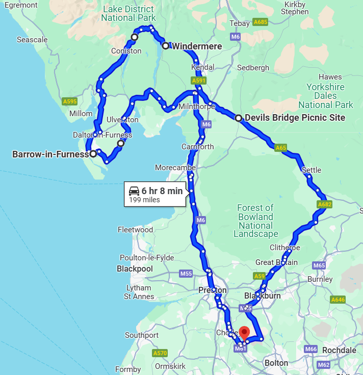 Two National Parks, two lakes, one river, one National Landscape, one pike and the sea. Country roads, single track roads, dual carriageways.