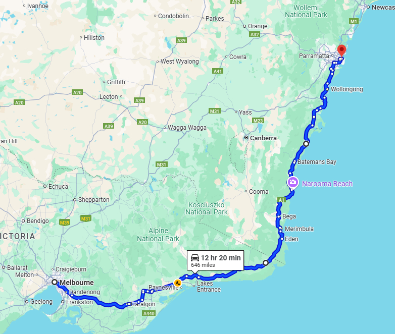 Batemans Bay is located on the Princes Highway (Highway 1) about 170 miles (280 km) from Sydney and 470 miles (760 km) from Melbourne. Canberra is located about 94 miles (151 km) to the west of Batemans Bay, via the Kings Highway.
