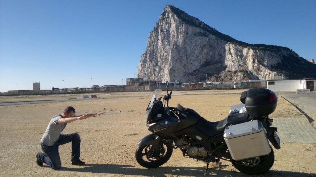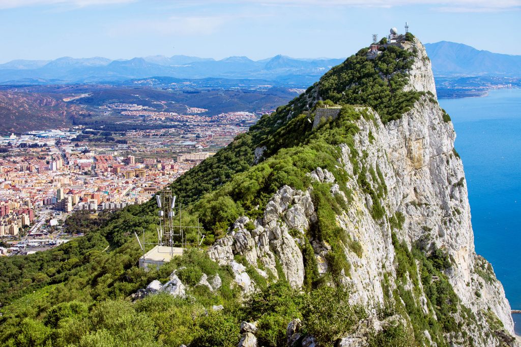 Gibraltar, is a British Overseas Territory and city located at the southern tip of the Iberian Peninsula, on the Bay of Gibraltar, near the exit of the Mediterranean Sea into the Atlantic Ocean (Strait of Gibraltar). It has an area of 2.6 square miles (6.8 km) and is bordered to the north by Spain (Campo de Gibraltar). The landscape is dominated by the Rock of Gibraltar.
