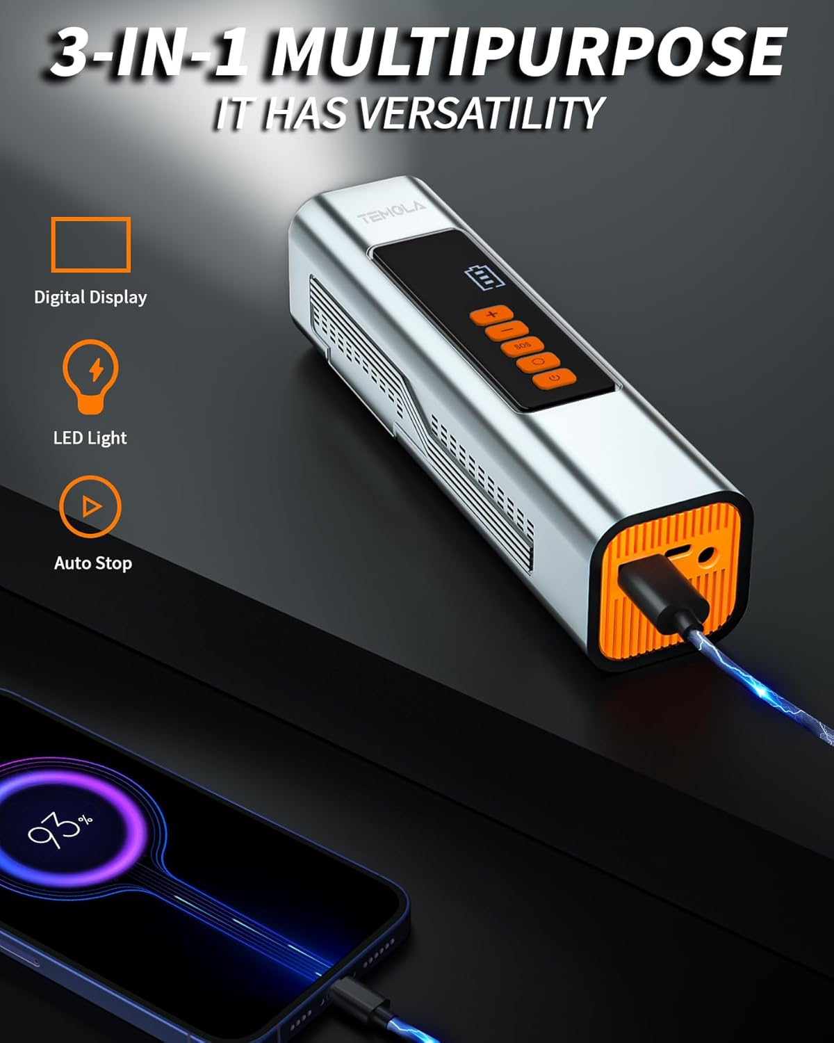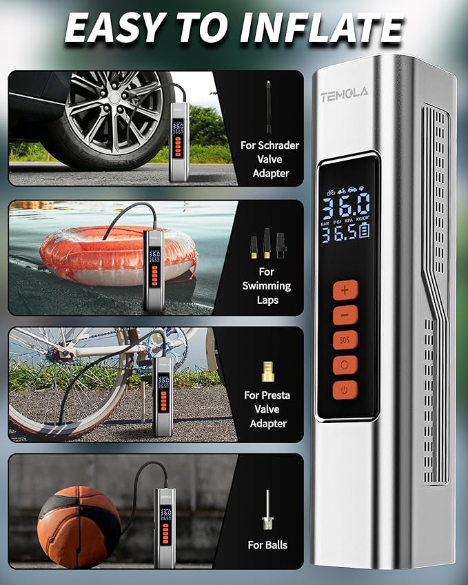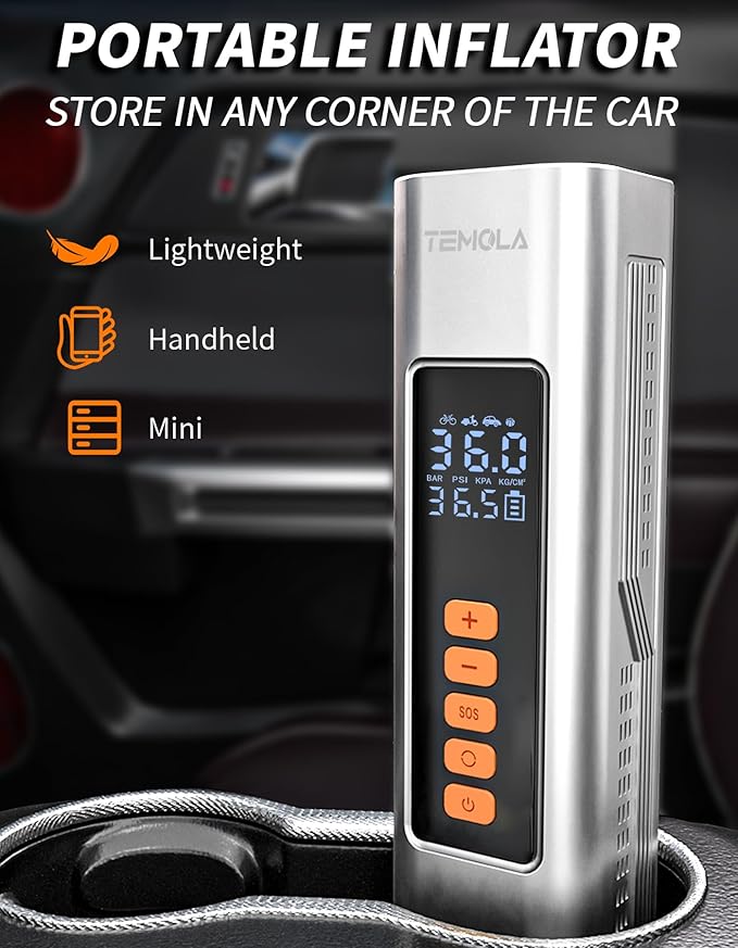 Easy to use and automatically shuts off: Just select your desired pressure with the “+” and “-” control buttons on the TEMOLA, plug the air hose into your vehicle, and press the centre “start” button. Once the correct pressure is reached, the car tire inflator will shut off on its own. This portable air pump makes inflating almost any tire a breeze (excluding trucks).