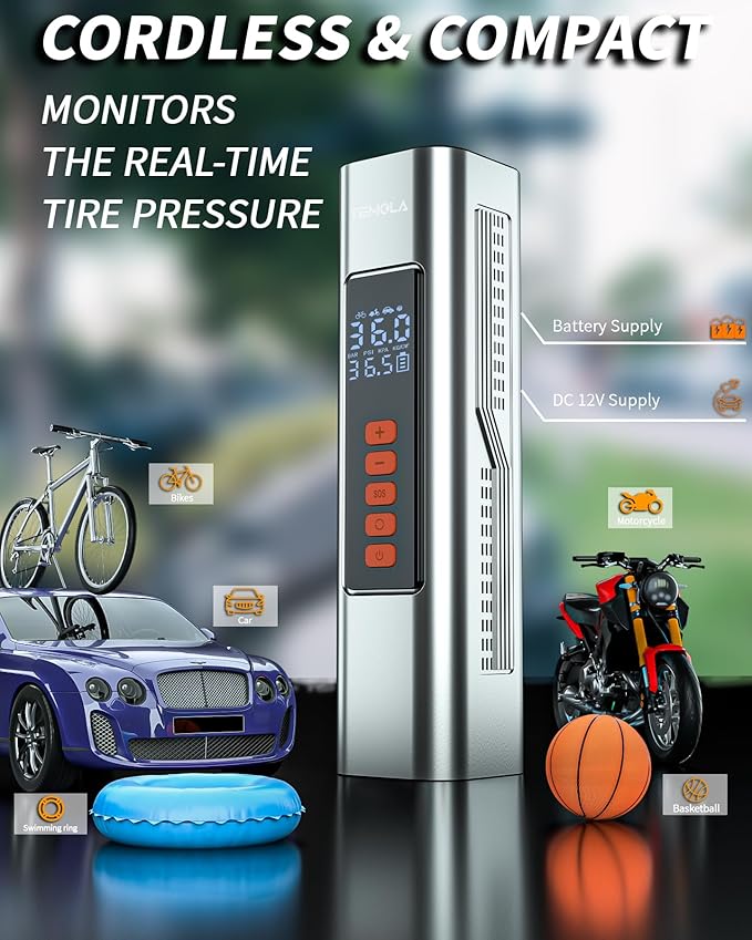 Mini but mighty: Measuring just 2 x 2.2 x 8.8 inches and weighing 0.9 pounds, this portable tyre inflator is compact and easy to store. With a maximum pressure of 150 PSI and an airflow of 34L/min, it inflates tyres fast. For example, it can boost a car tyre from 29 to 36 PSI in just a minute, and fully inflate from 0 to 36 PSI in only 5 minutes, making it a perfect car accessory for quick tyre inflation.