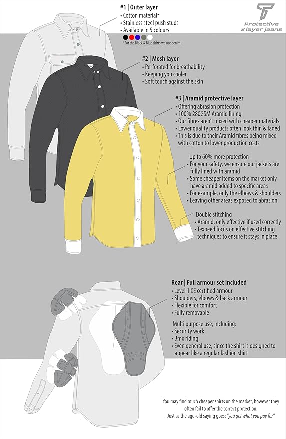 - Fully reinforced motorcycle shirt Made with 280gsm DuPont Kevlar lined motorcycle shirt. In various colours & sizes.