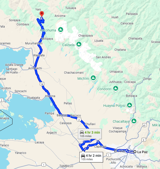 Along the road to Sorata, through National Route 2 and Road 16, there are impressive views of the Cordillera Real mountains and Lake Titicaca, one of the top destinations in Bolivia. Plus, whenever it’s clear you’ll see the towering, snowcapped peaks of Ancohuma and Illampu.