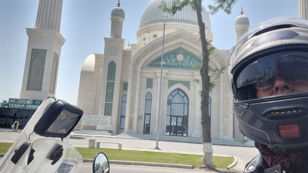 Back into the onslaught of traffic and onwards to Samarkand, I allowed myself the luxury of a prebooked hotel and Google maps to take me there. However my phone overheated and close down. I headed for the centre noticing for the first the unique Uzbekistan architecture. The silk road weaved through closed streets due to weddings or some such artery clogging celebration. I’ll spare you the U turn navigation details but the heat was radiating off the engine so fiercely that the tank, expanding with boiling petrol, vented fumes that were overpowering. Soaked with the last moisture my body had in it, stressed to the point of breaking, and don’t forget I had wild camped last night, hygiene was not high on the agenda. Phone, bike, buildings, road, cars, everything was at boiling point and radiating that heat that had nowhere to go due to a sun that was beating down everything that was trying to rise like hot air supposedly does.