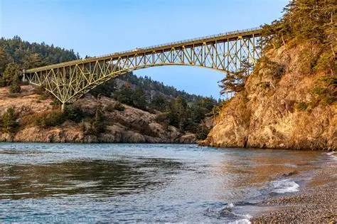 After Ebey’s windswept trails, Deception Pass Bridge brings the drama with twin steel arches soaring 180 feet above swirling turquoise water.