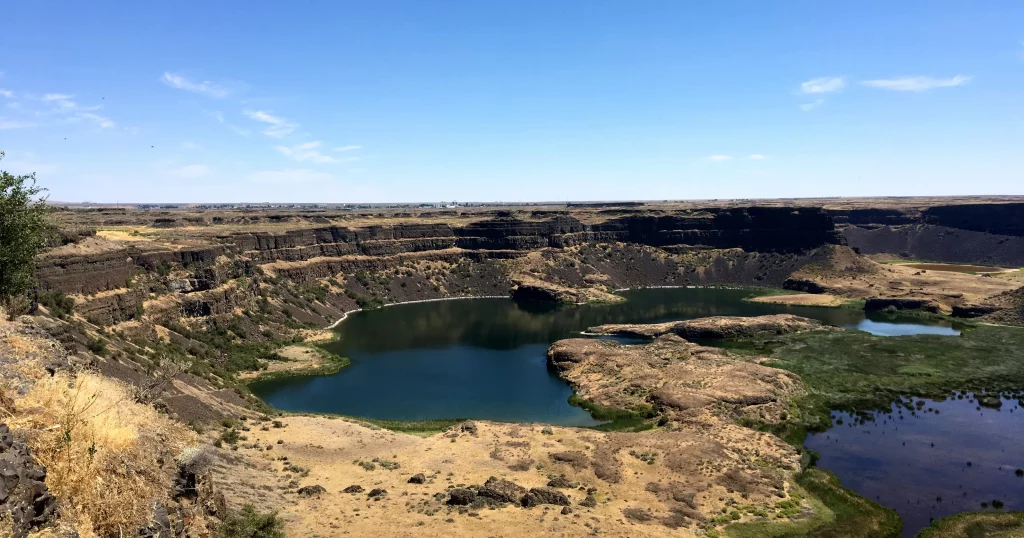 This ancient Ice Age giant was four times wider than Niagara and ten times the flow, but now you’ll see a massive cliff towering over a dry canyon with a few sparkling lakes at the bottom.