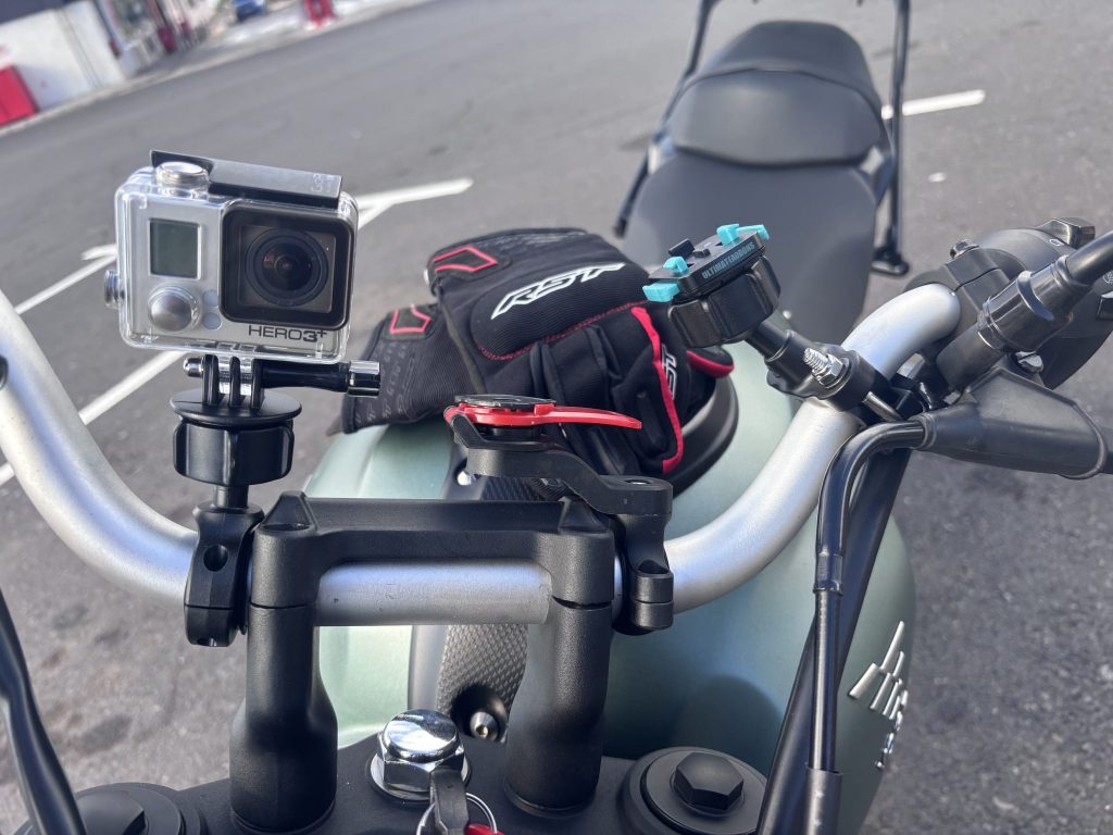 Nige uses the UltimateAddons handlebar camera mount. It is currently on his Royal Enfield Interceptor 650 but has been used on the Voge in Tenerife and on his Suzuki GS500f.