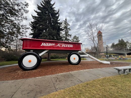 Finally, roll into Spokane’s Riverfront Park and there it is—a giant red Radio Flyer wagon that’s also a playground slide.