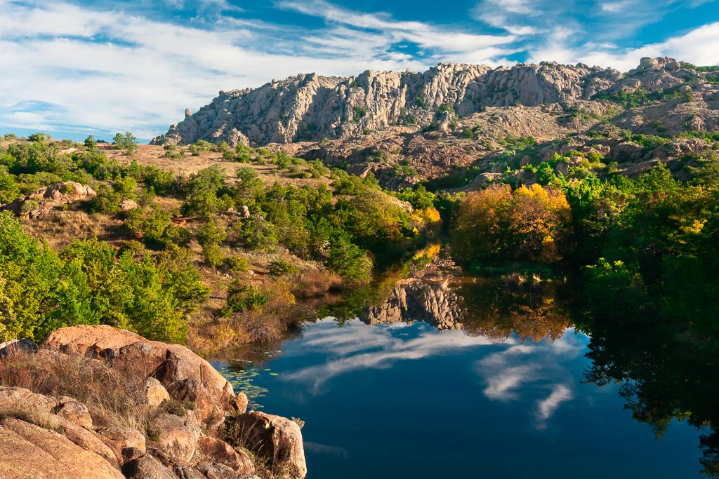 Wichita Mountains Wildlife Refuge, located in southwestern Oklahoma near Lawton, has protected unique wildlife habitats since 1901 and is the oldest managed wildlife facility in the United States Fish and Wildlife Service system. The refuge’s location in the geologically unique Wichita Mountains and its areas of undisturbed mixed grass prairie make it an important conservation area. The Wichita Mountains are approximately 500 million years old. Measuring about 59,020 acres (238.8 km2), the refuge hosts a great diversity of species: 806 plant species, 240 species of birds, 36 fish, and 64 reptiles and amphibians are present.