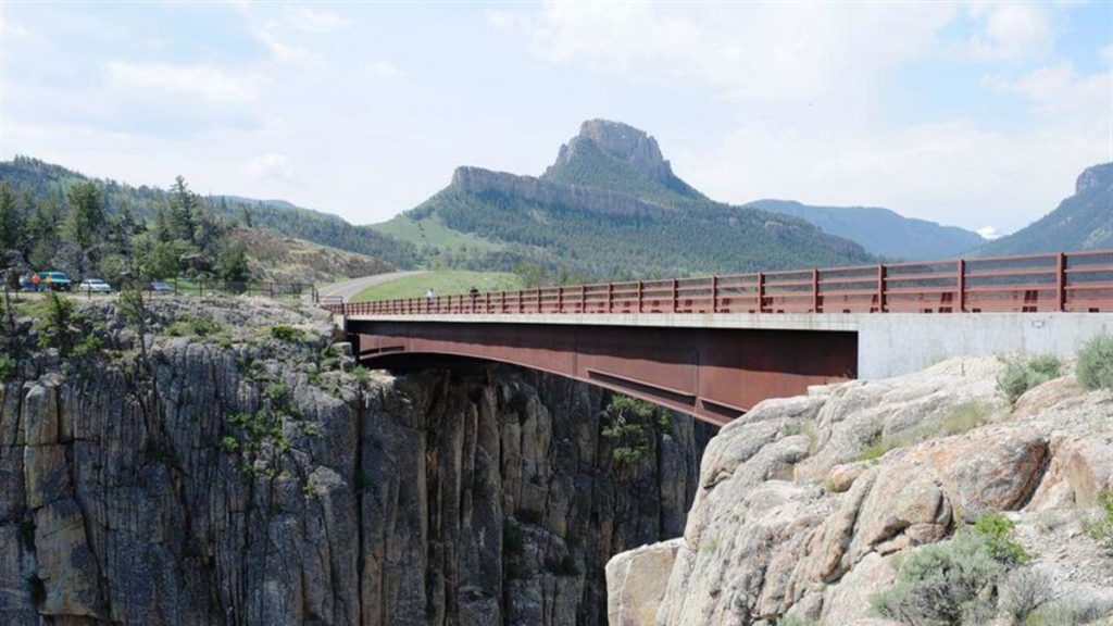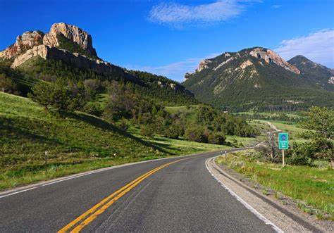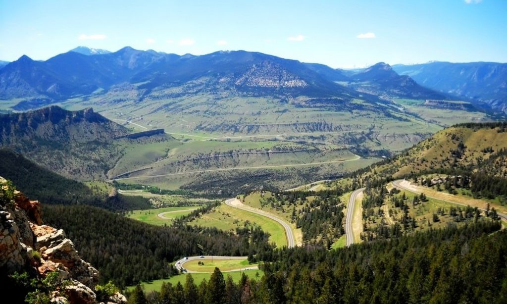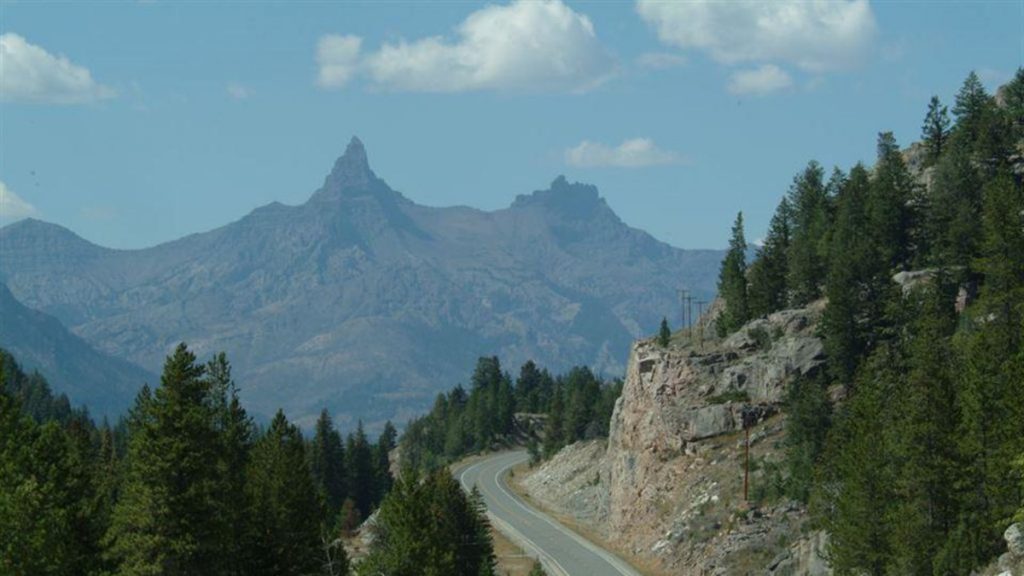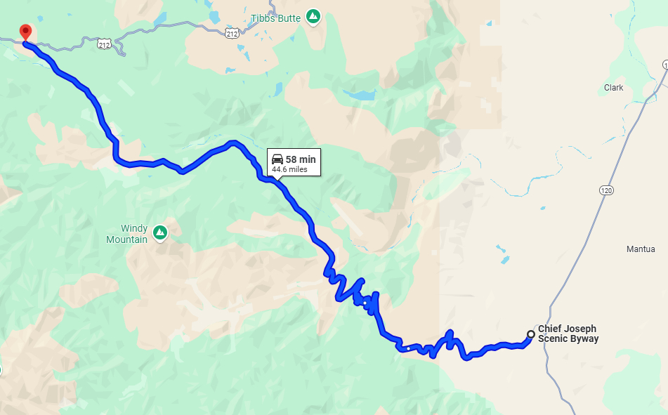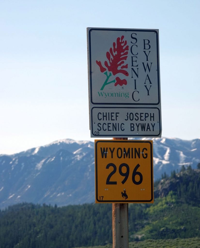 The Chief Joseph Scenic Byway, Wyoming 296, links the town of Cody with the Beartooth Highway and the Northeast Gate of Yellowstone National Park. The route crosses the Shoshone National Forest through the Absaroka Mountains to the Clarks Fork Valley. The 45 paved miles of the Scenic Byway run from the junction with U.S. 120, 17 miles north of Cody, northwest to their connection with U.S. 212, the Beartooth Highway. The Beartooth Mountains and the Clarks Fork of the Yellowstone River lie to the north of the road, and the Absaroka Mountains and North Absaroka Wilderness are to the south.